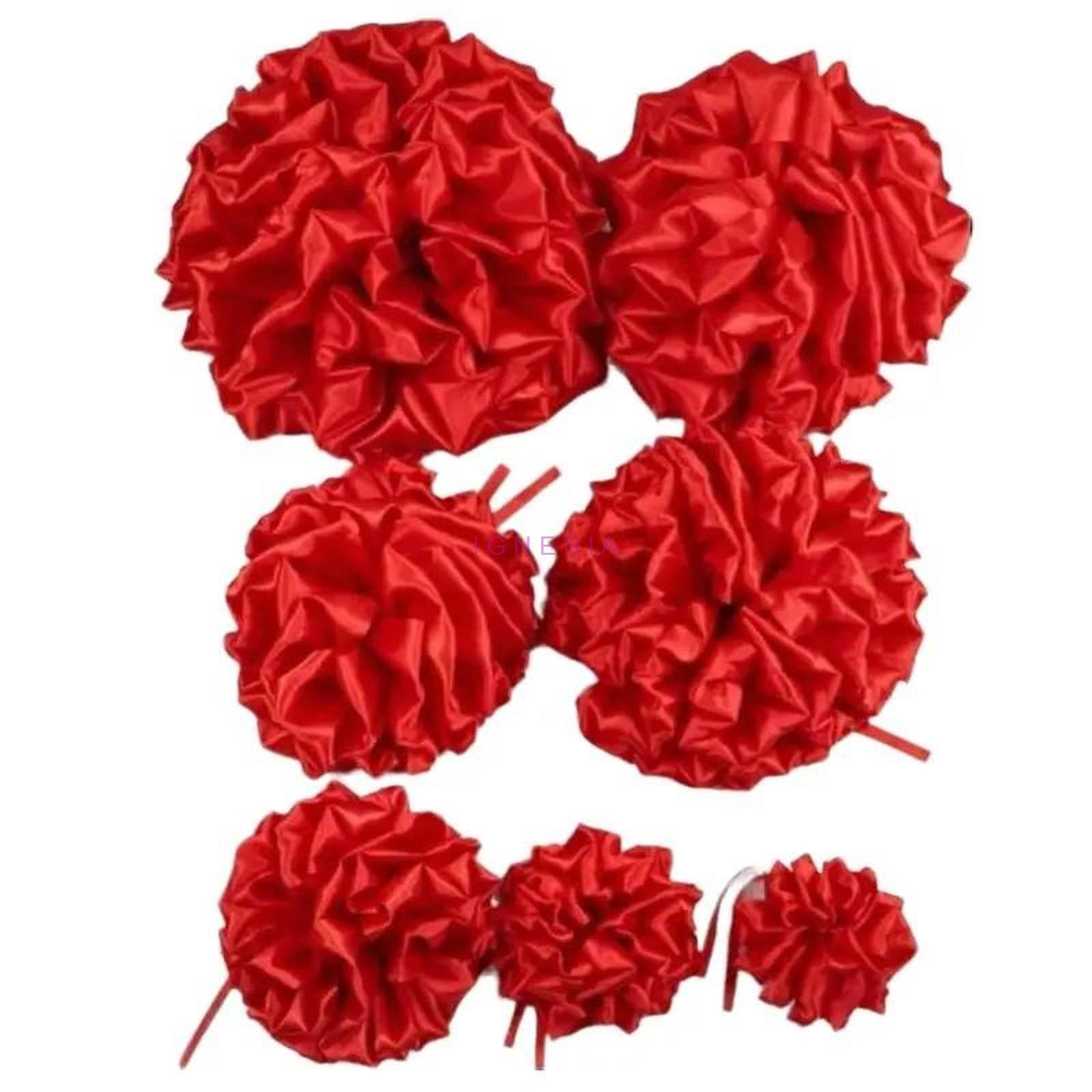 - Bunga Kain Seremonial (Red Flower Ball): Kami mendesain bunga kain dalam bentuk pompom atau flower ball yang padat. Desain ini melambangkan kesempurnaan, keutuhan, dan kebahagiaan ganda (Shuāngxǐ). Bunga ini menjadi titik fokus visual yang sangat fotogenik.